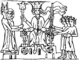Udělení léna. Římský král (nebo císař) uděluje léna biskupovi, abatyši a světským knížatům. Podle vyobrazení z Heidelberského rukopisu, tzv. Sachsenspiegelu, z 1. čtvrtiny 14. století. J. Žemlička: Století posledních Přemys- lovců, 1998, s. 42. |